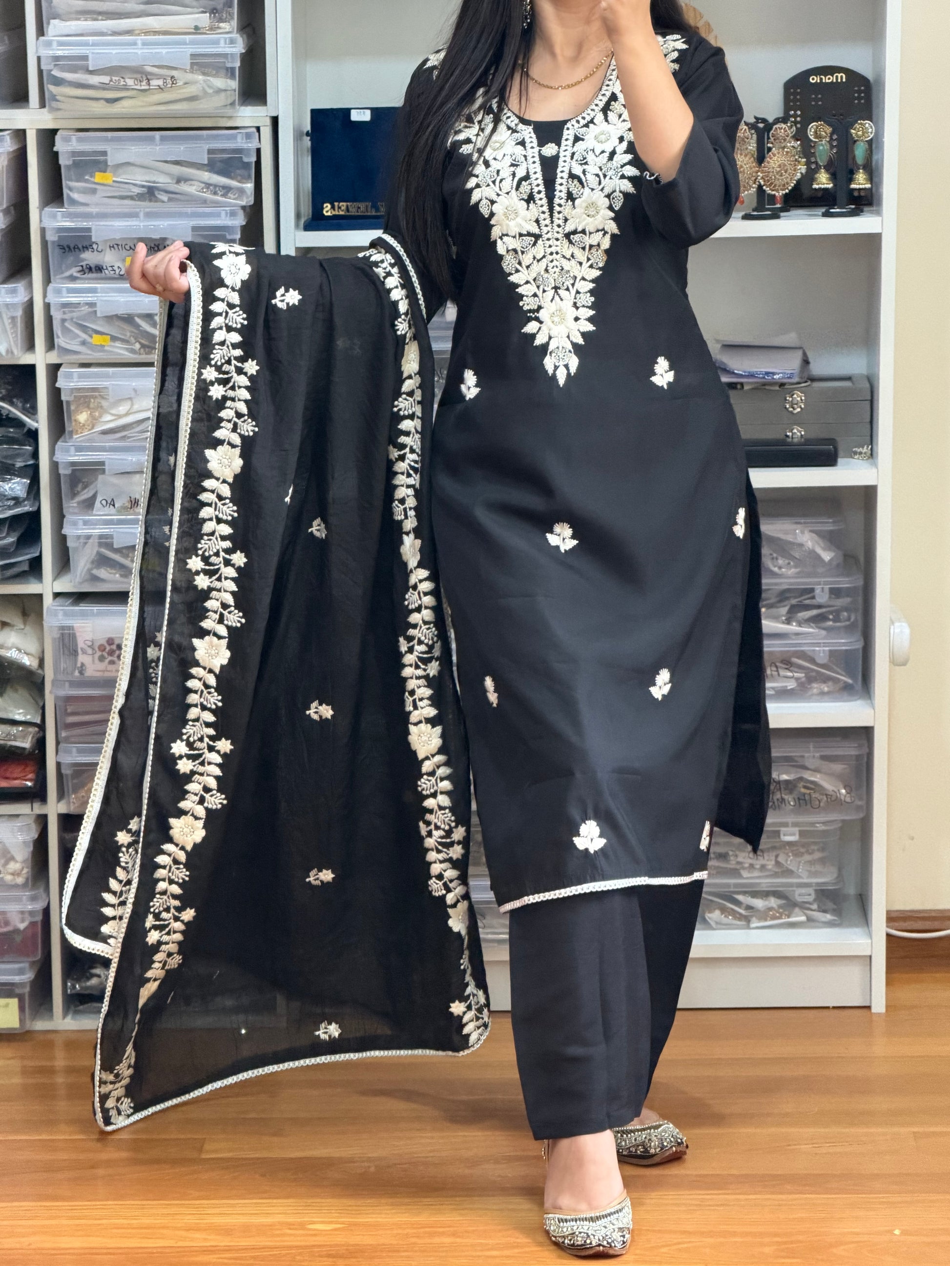 Elegant Black Roman Silk Suit with Heavy Embroidery