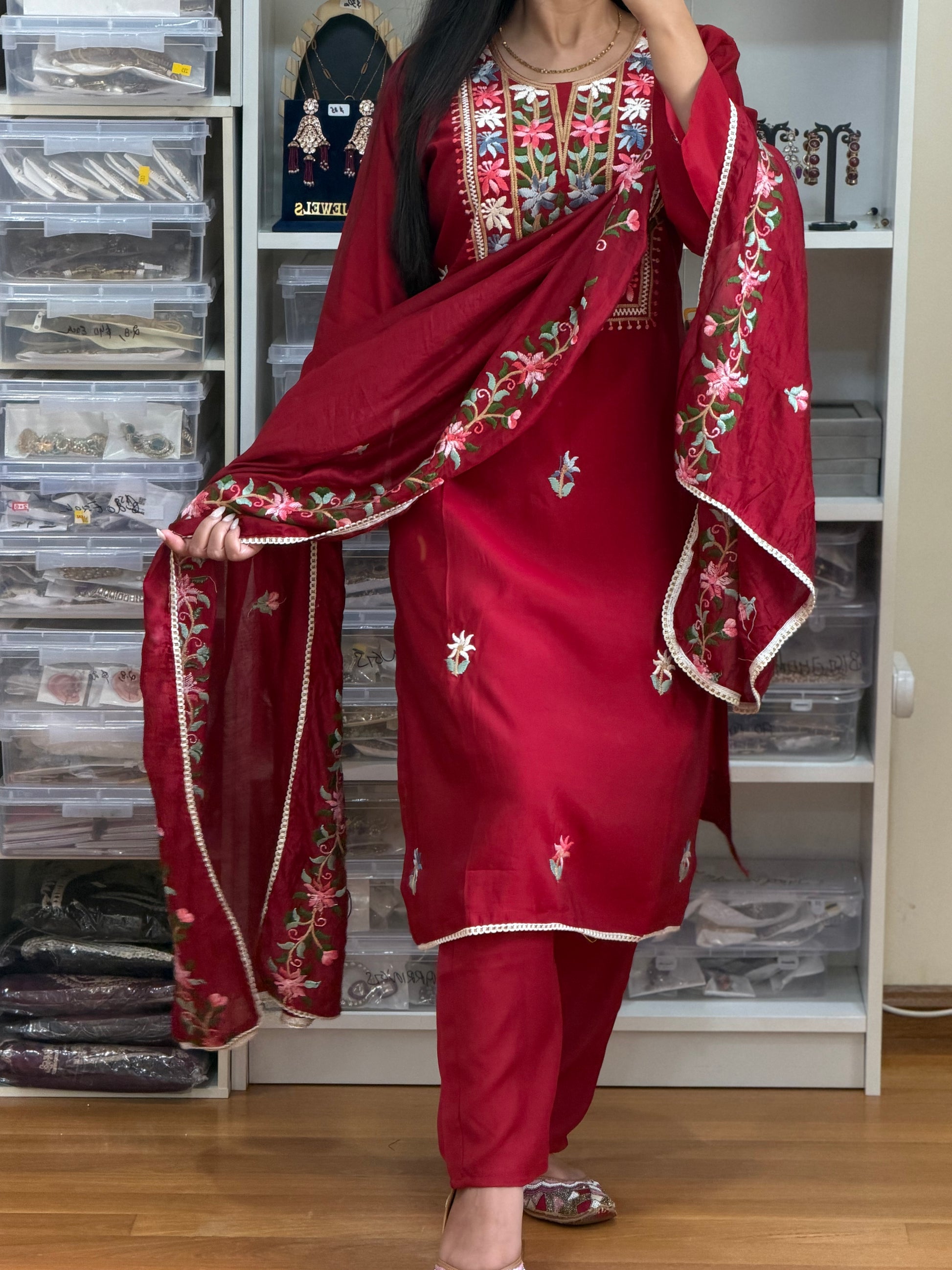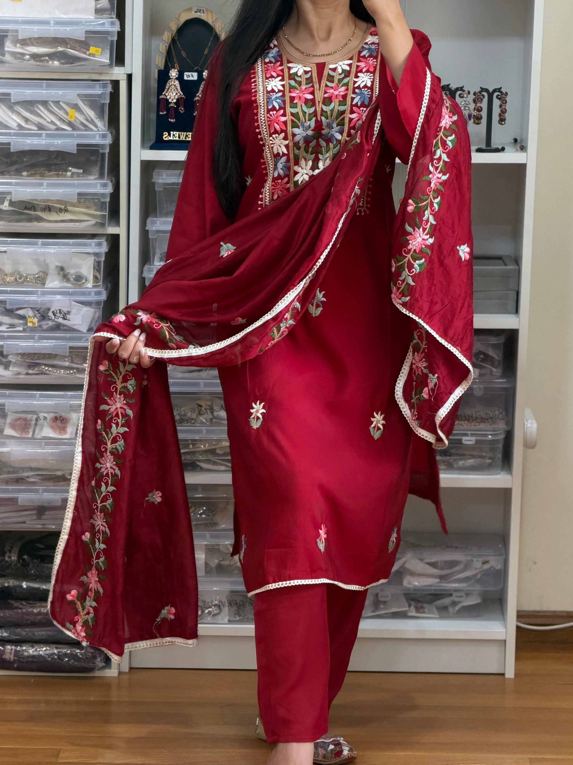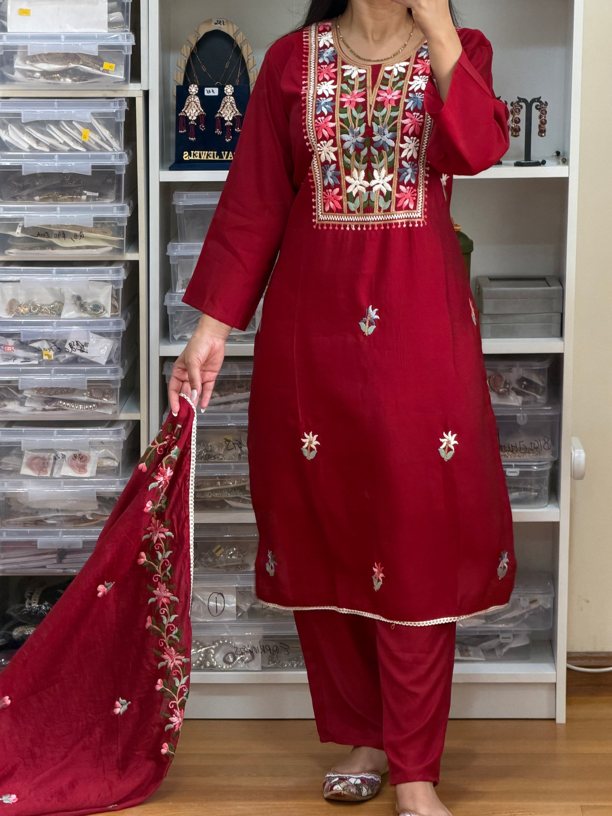 Maroon Roman Silk Embroidered Suit