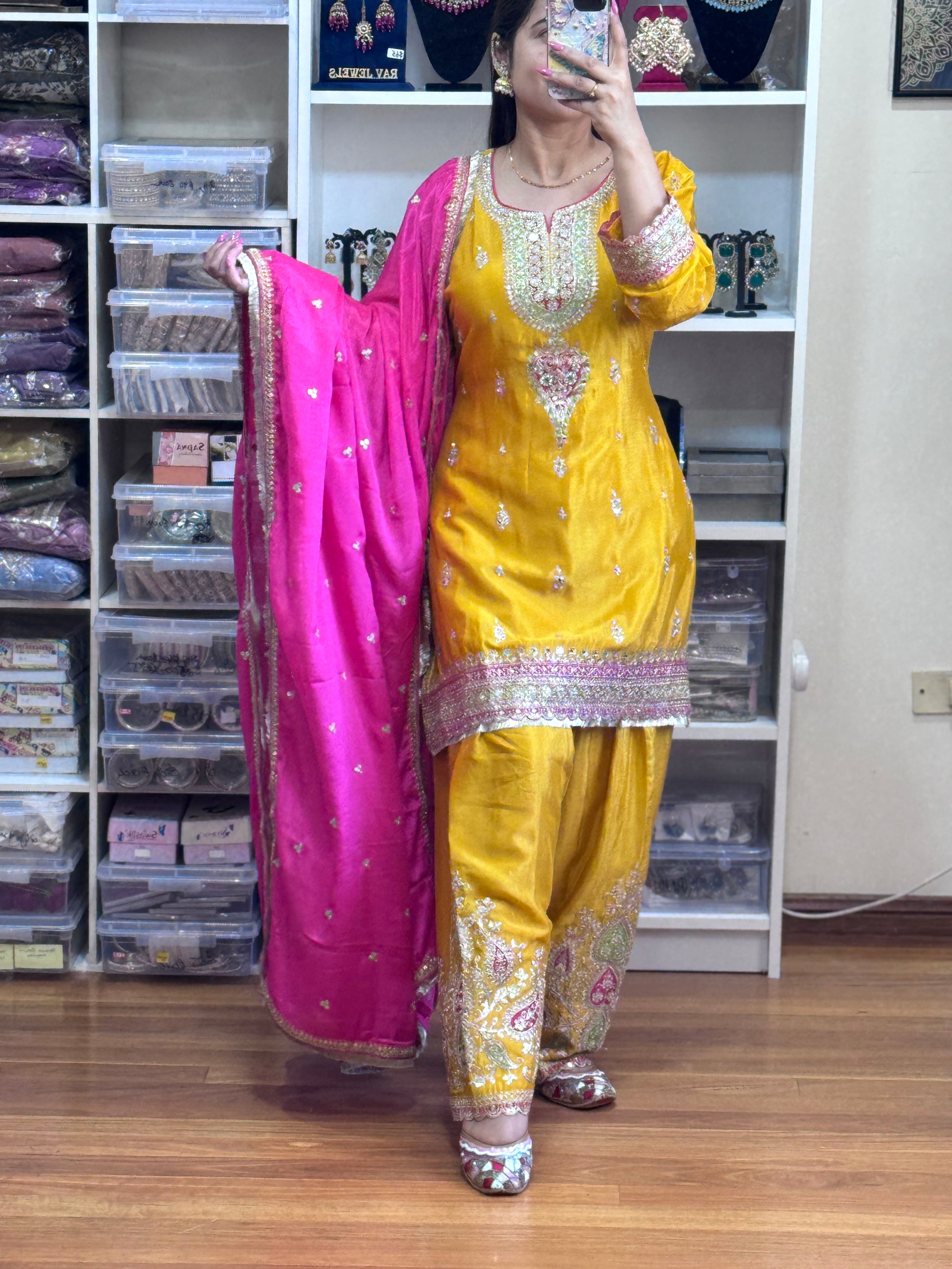 PREMIUM CHINON FARSHI SALWAR SUIT(Ready size 42 with margin upto 46)